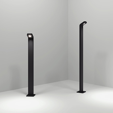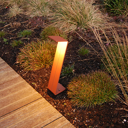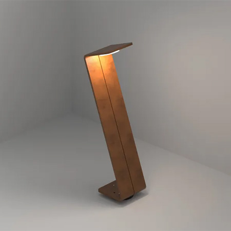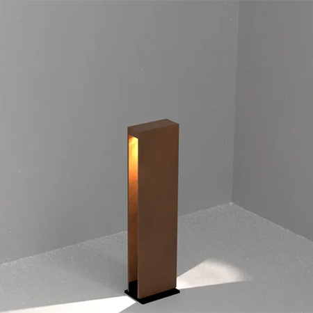 Dexter collection features bollards, wall lights, ceiling lights and inground lights, balancing geometric design with natural expression, and using durable materials like corten steel and powder-coated aluminium, to deliver timeless and architectural lighting for gardens, terraces, and hospitality projects, such as hotels and restaurants.