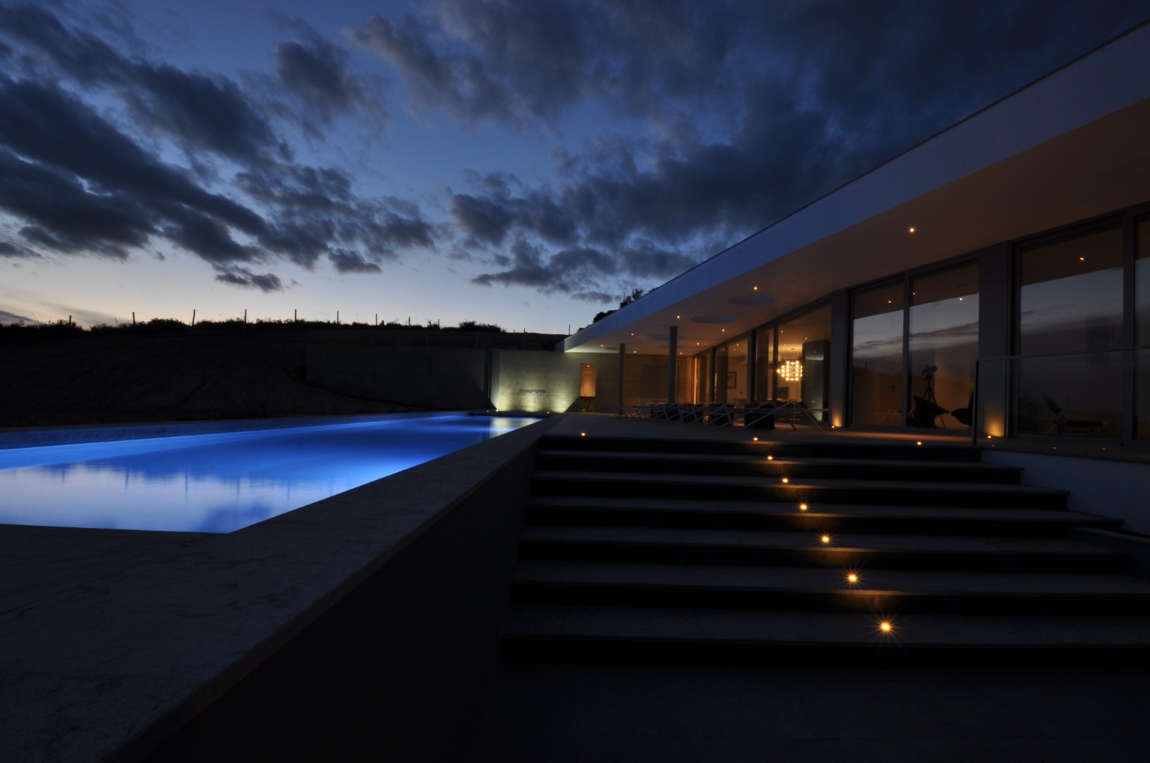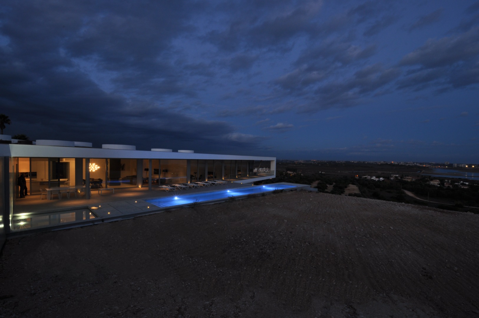 With water features and subtle illumination, the design creates a sense of calm sophistication while seamlessly blending with the surrounding landscape.