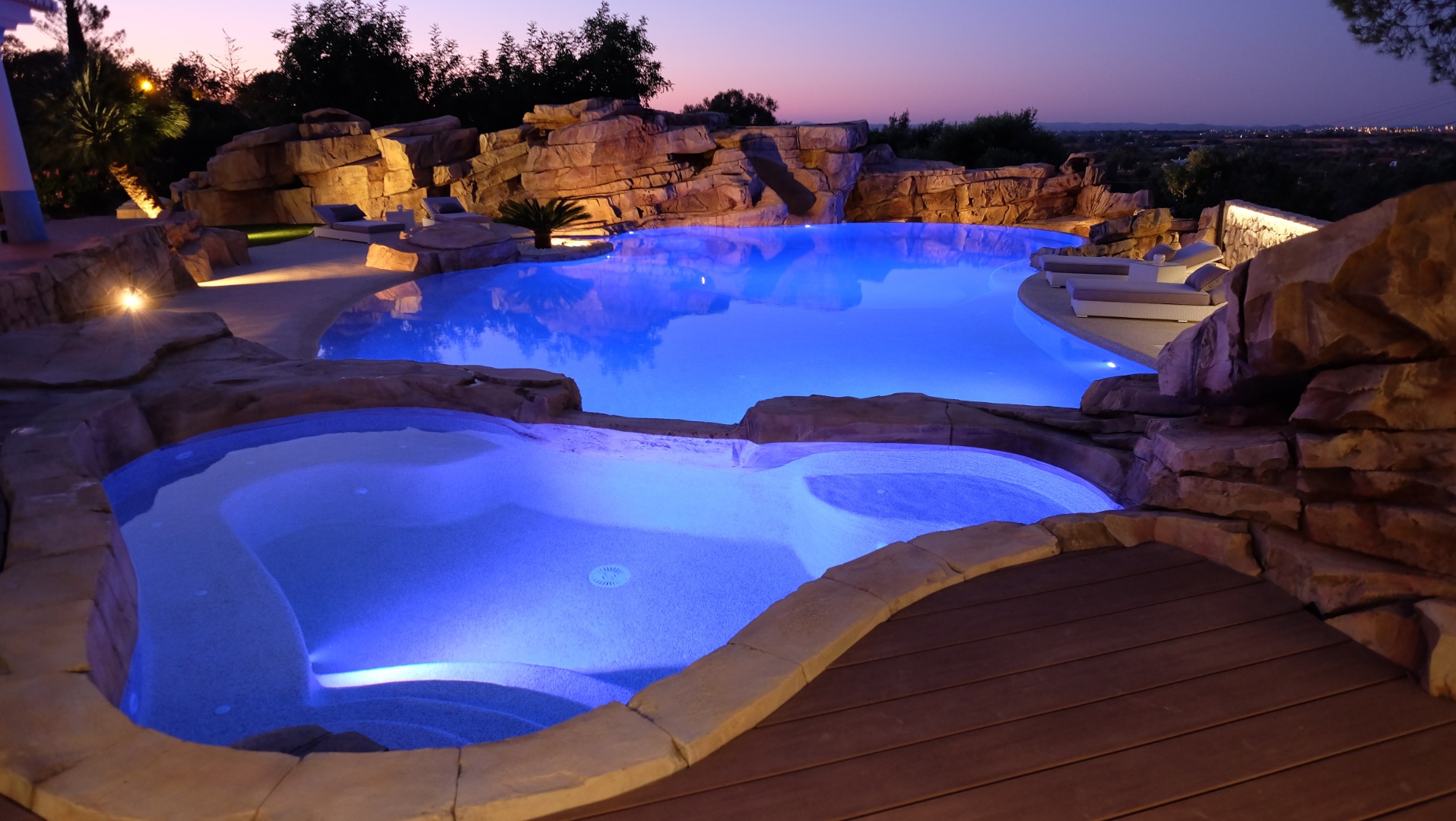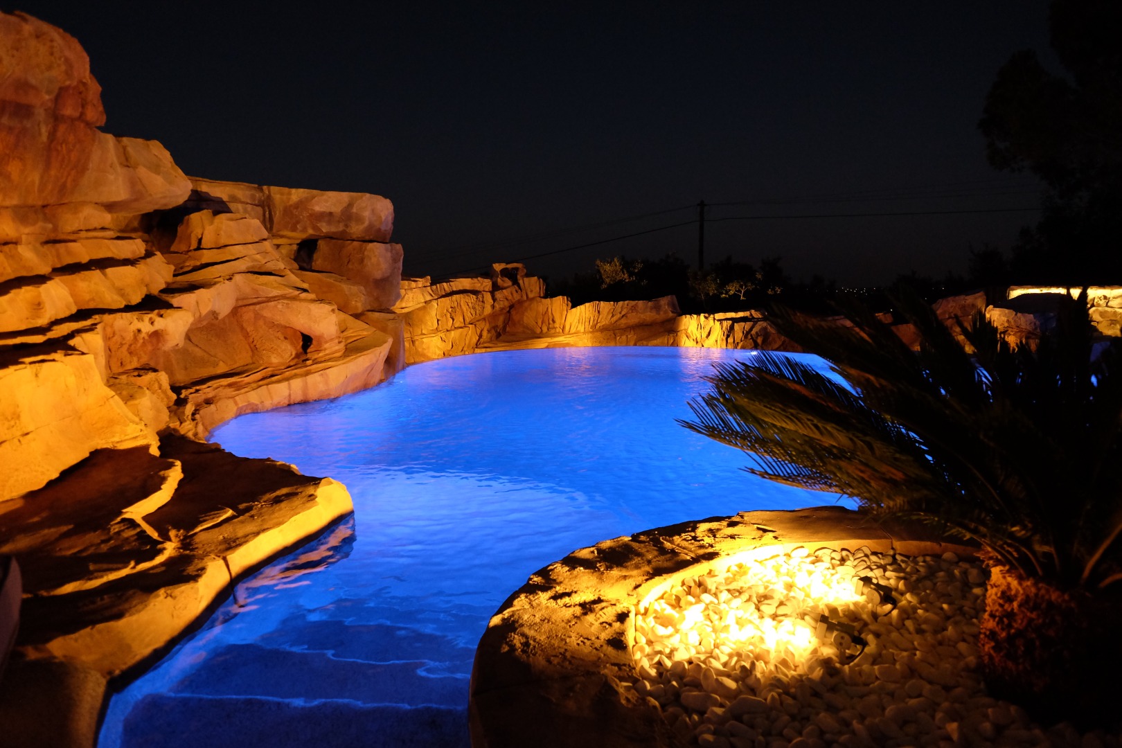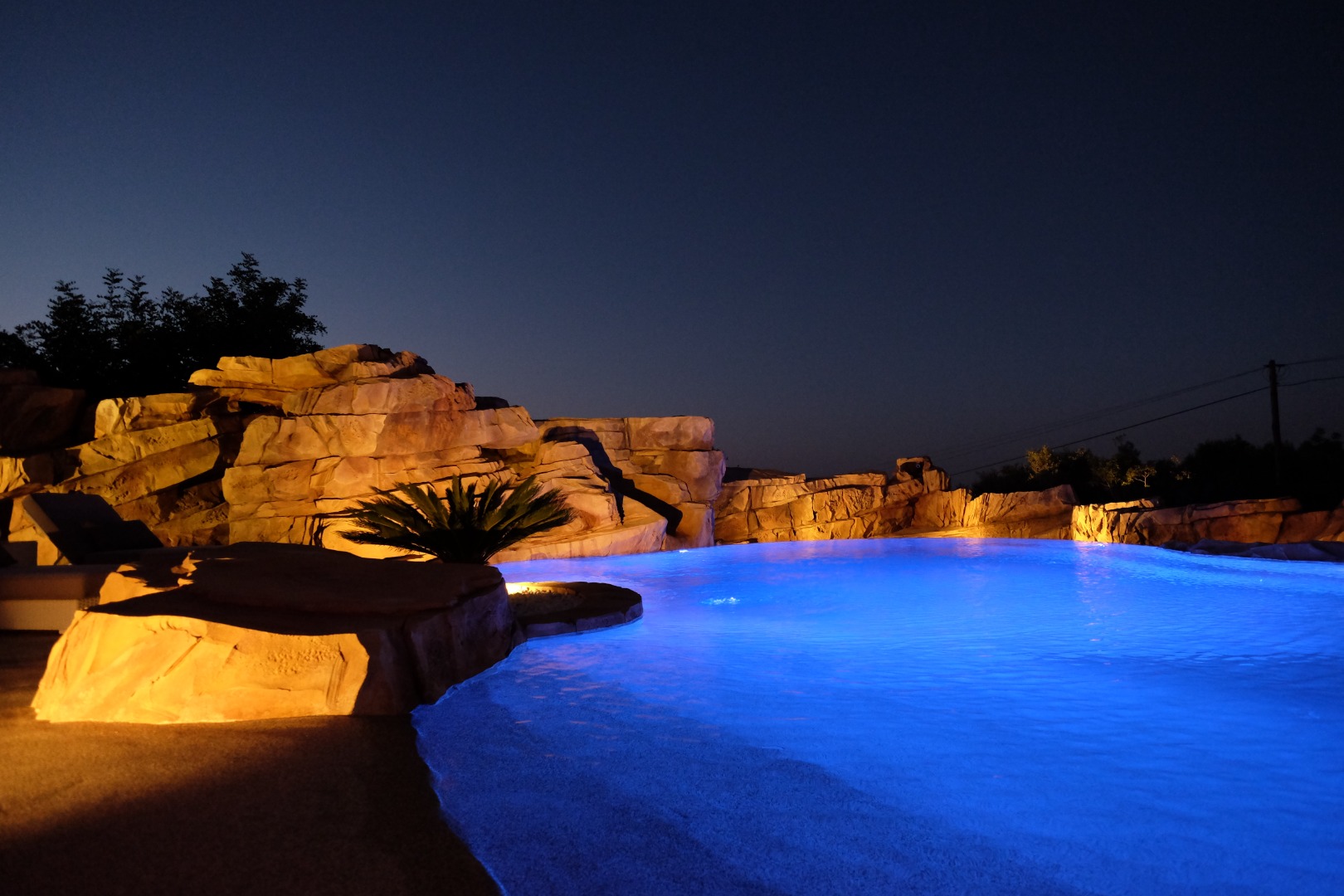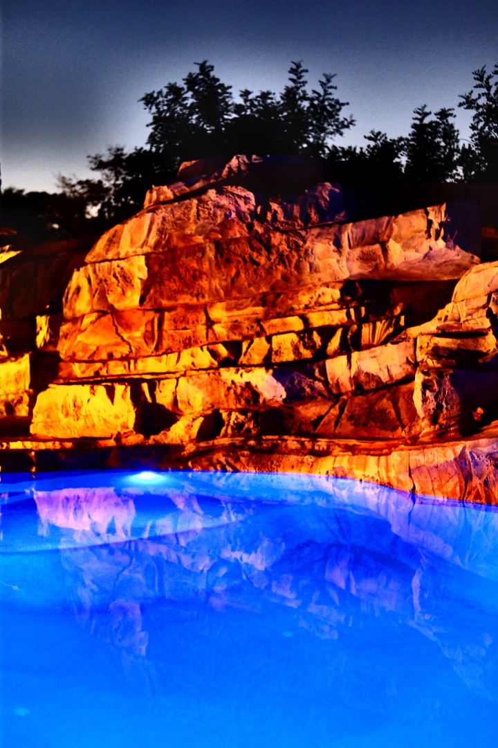 This stunning rock pool garden blends natural textures with nice lighting, creating a magical retreat. The interplay of water, stone, and soft illumination transforms the space into a tranquil escape, perfect for relaxation. A true harmony of nature and design.