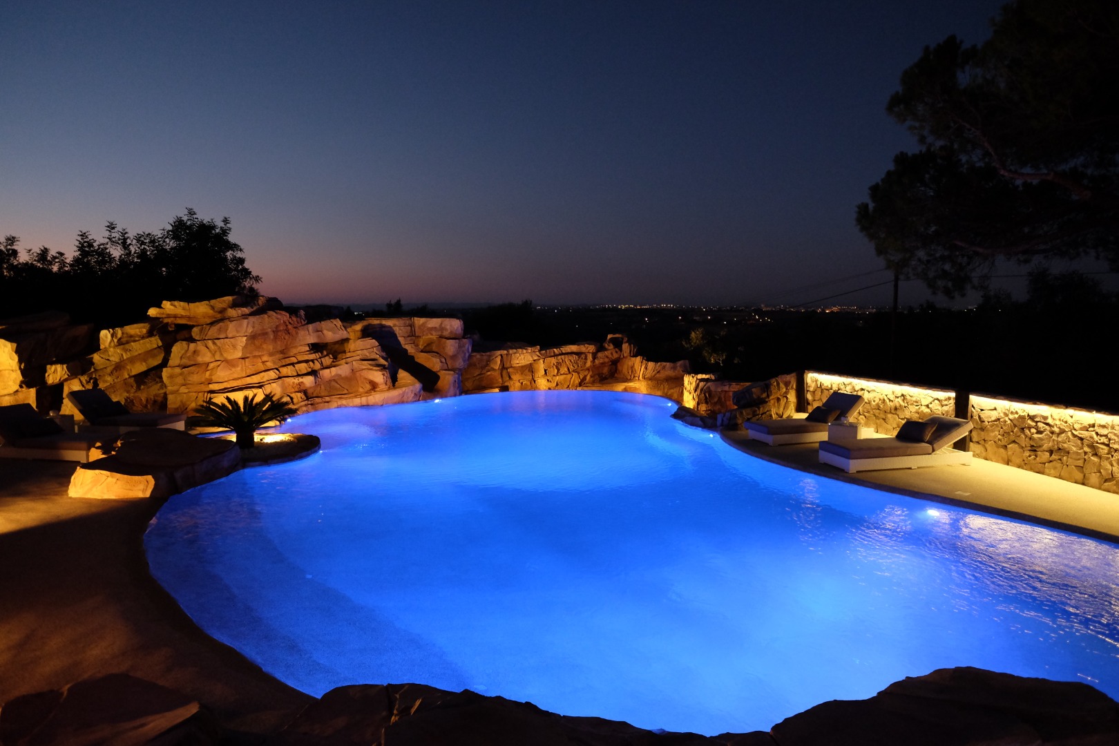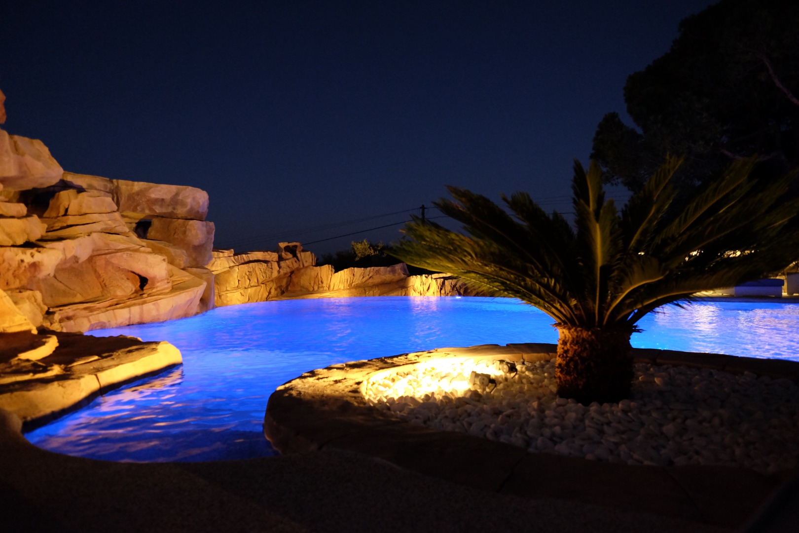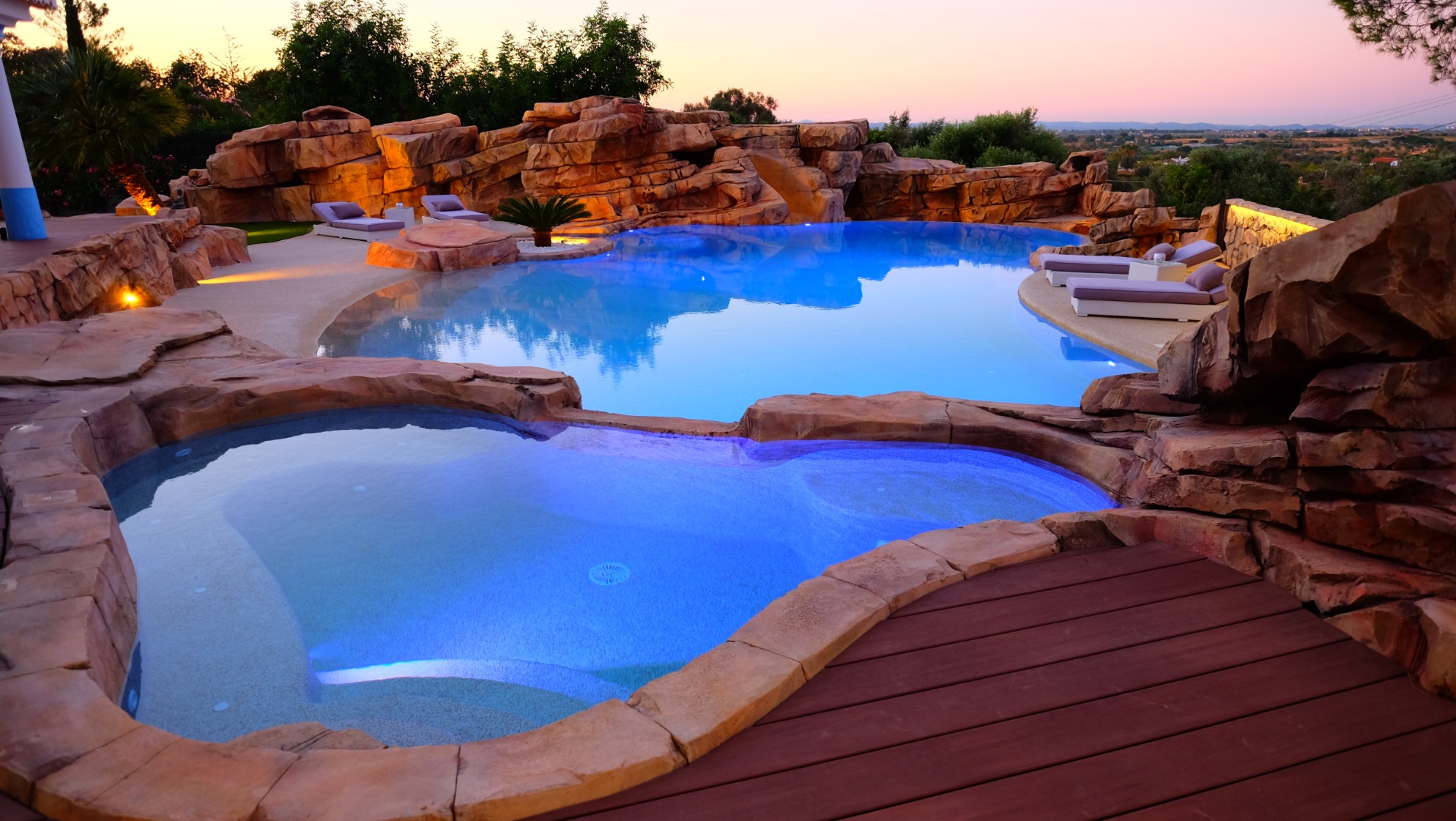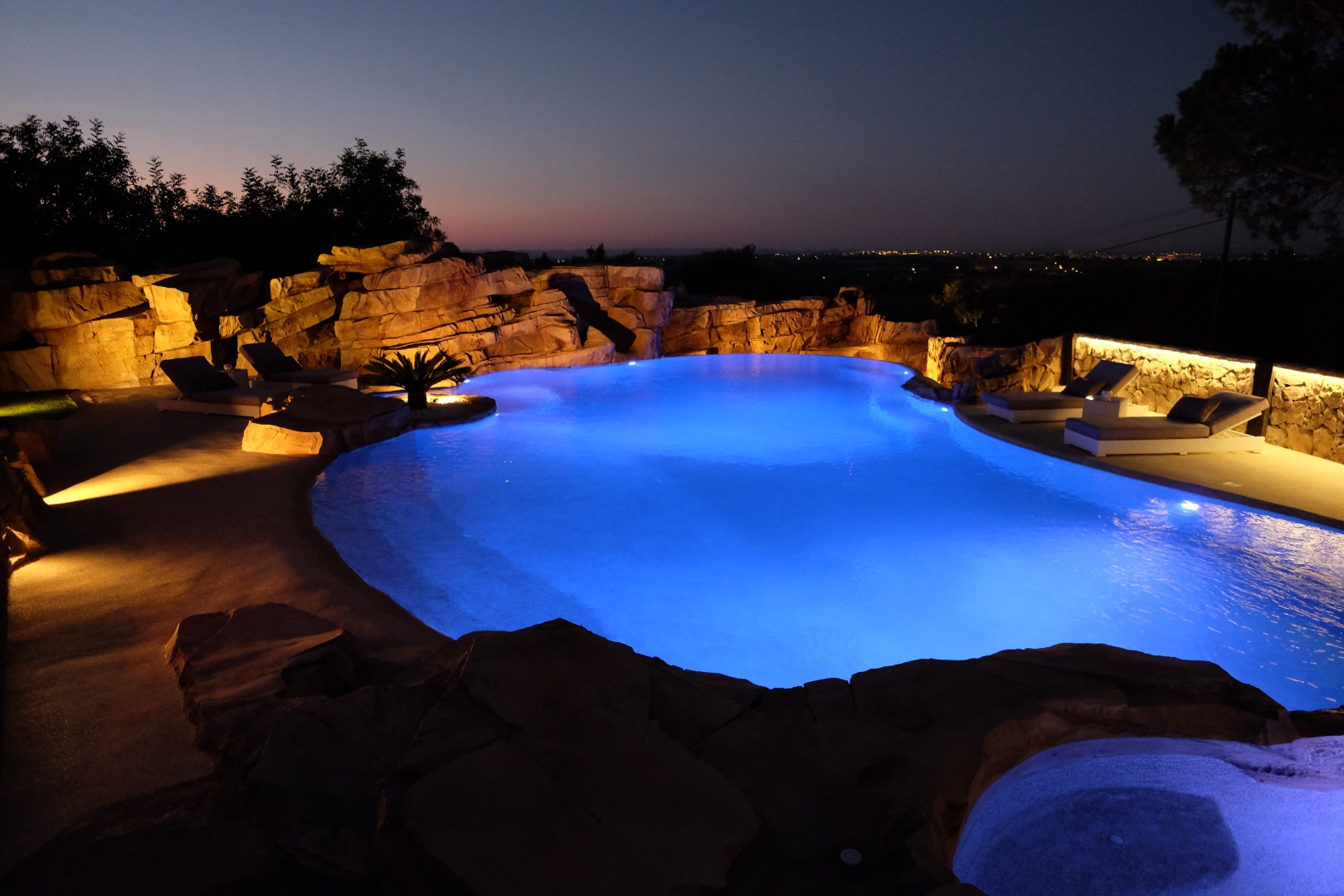 This stunning rock pool garden blends natural textures with nice lighting, creating a magical retreat. The interplay of water, stone, and soft illumination transforms the space into a tranquil escape, perfect for relaxation. A true harmony of nature and design.
