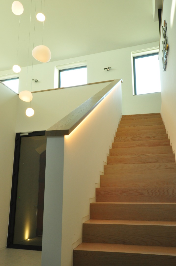 The lighting in this project highlights de modern architecture through the use of sleek indirect lines. These create a floating effect on te structure and emphasize the wooden beams and glass features. Inside, warm lighting provides a cozyy atmosphere, while outside the illumination enhances the architectural details and reinforces de transition between old and new.